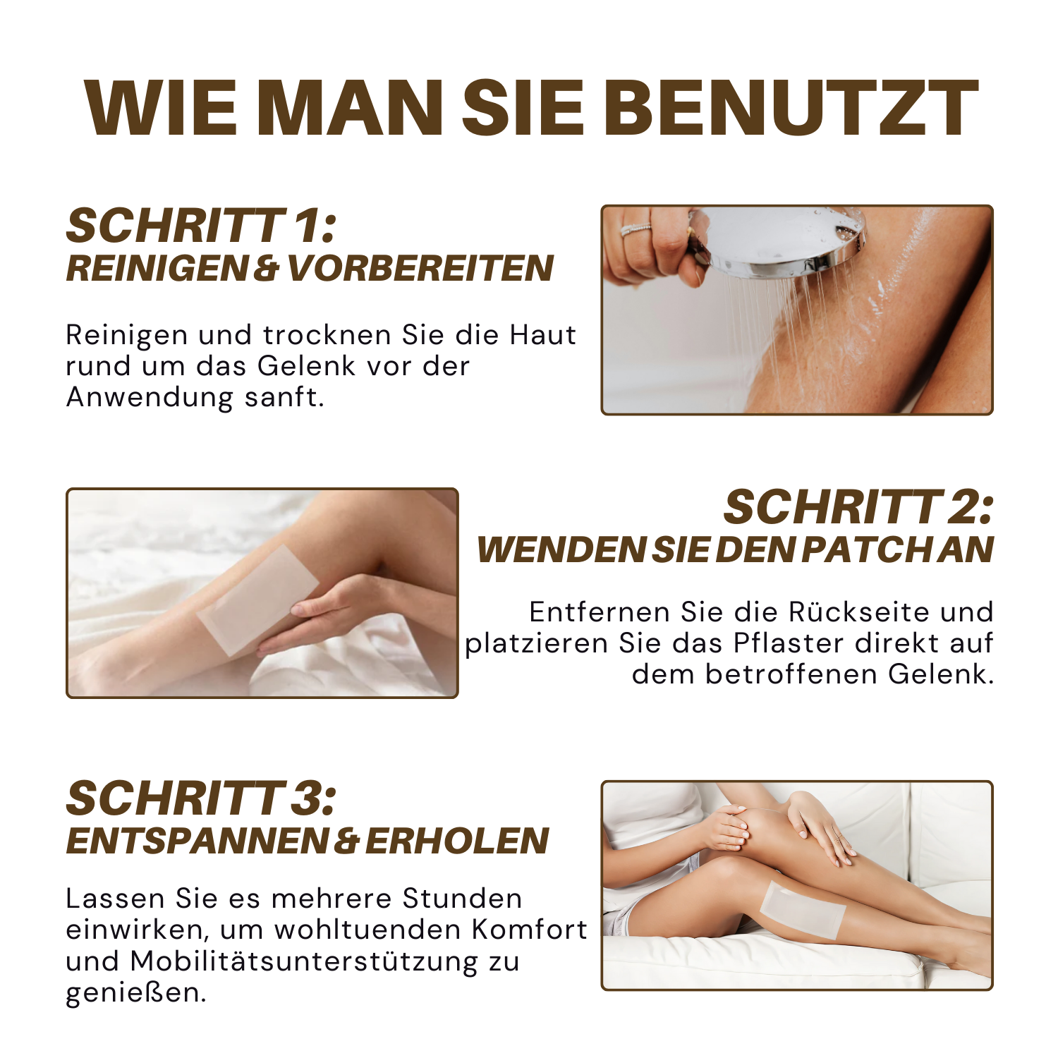 3️⃣ Sicher und einfach – Ein natürliches, nicht-invasives Pflaster, das Sie einmal täglich tragen. Keine fettigen Gele, keine brennenden Cremes, keine Tabletten mit Leberwarnungen, keine furchterregenden Spritzen oder Operationen.