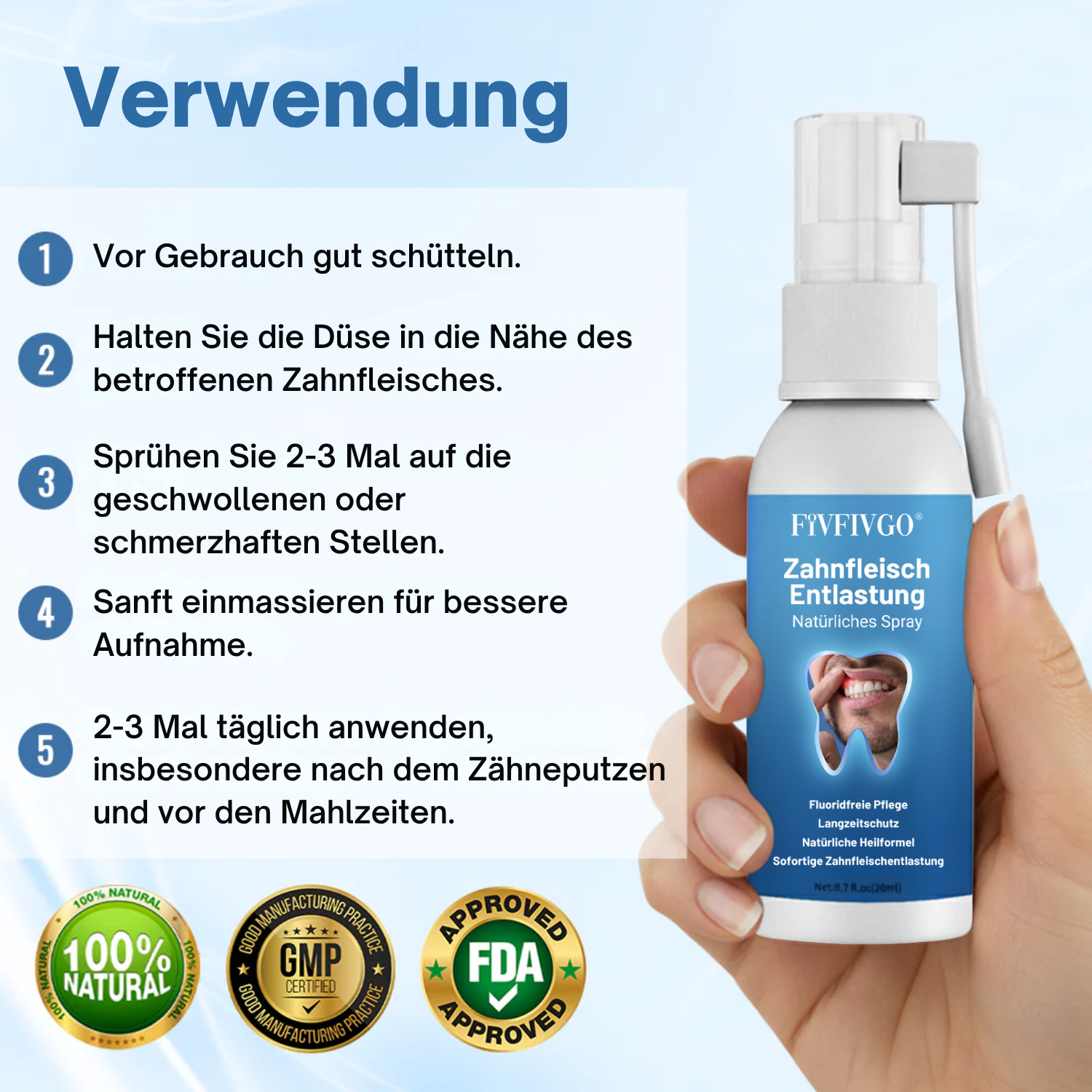 Schmerzen, Schwellungen und Empfindlichkeit des Zahnfleisches können selbst alltägliche Dinge wie Essen, Zähneputzen oder Trinken unangenehm machen. Ständige Reizungen oder Schmerzen nach dem Zahnarztbesuch können Ihren Alltag beeinträchtigen und Ihr Selbstbewusstsein mindern. Deshalb wurde Fivfivgo® ZahnfleischEntlastung Natürliches Spray entwickelt – für sofortige, wohltuende Linderung direkt an der Ursache. Seine natürliche Formel hilft, Entzündungen zu beruhigen, Beschwerden zu lindern und die Zahnfleischgesundheit wiederherzustellen – für anhaltenden Komfort und Schutz.