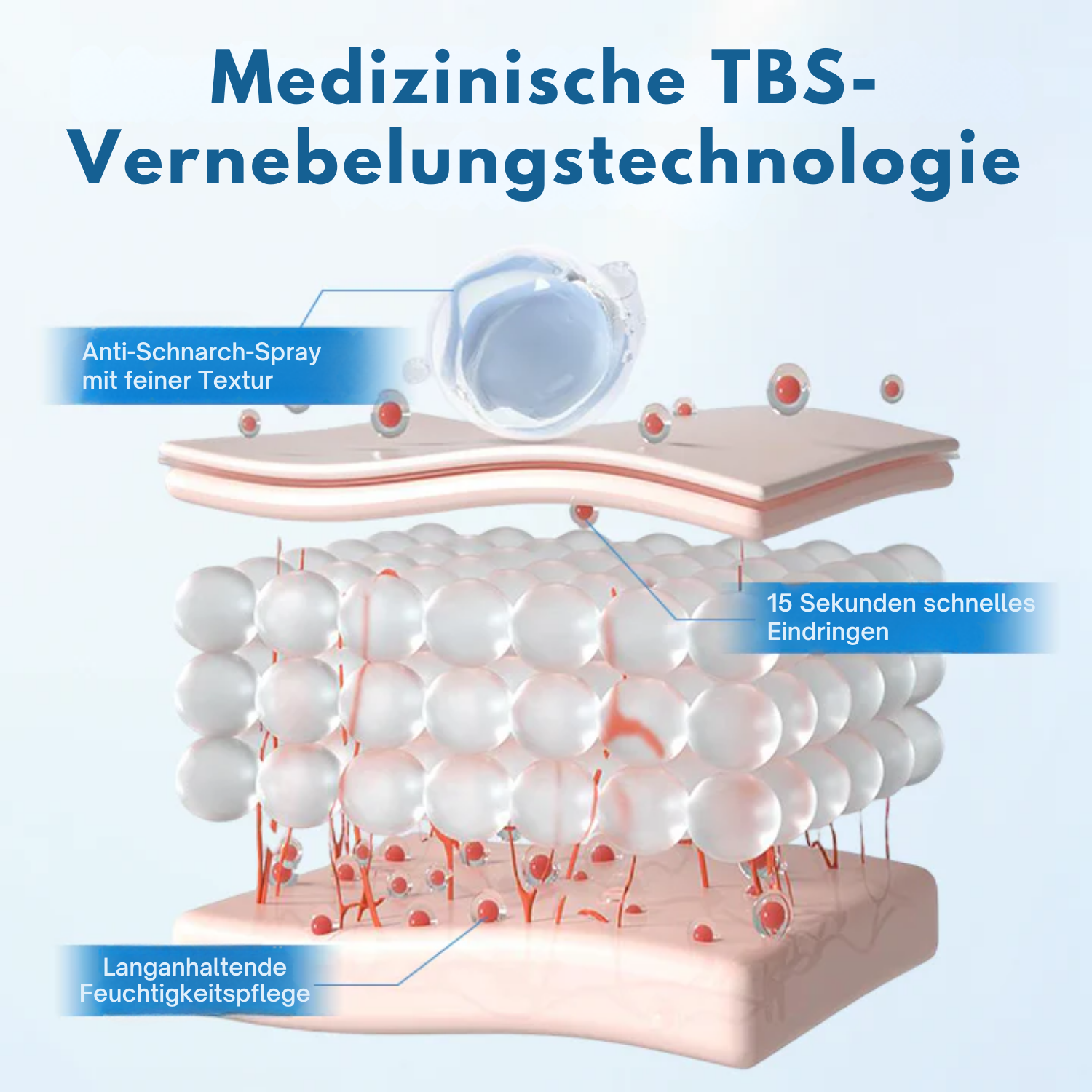 - 38-facher Effizienzvorteil – Im Vergleich zu Standardsprays erreicht TBS-Nebel eine bis zu 38-mal höhere Gewebeabsorption, was zu einer schnelleren und länger anhaltenden Schnarchreduzierung führt.